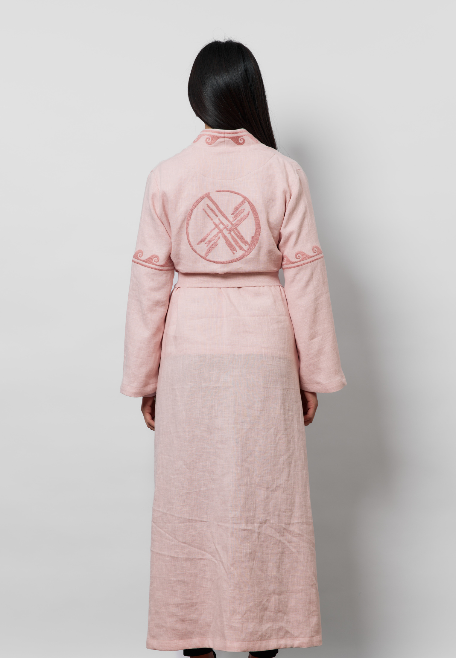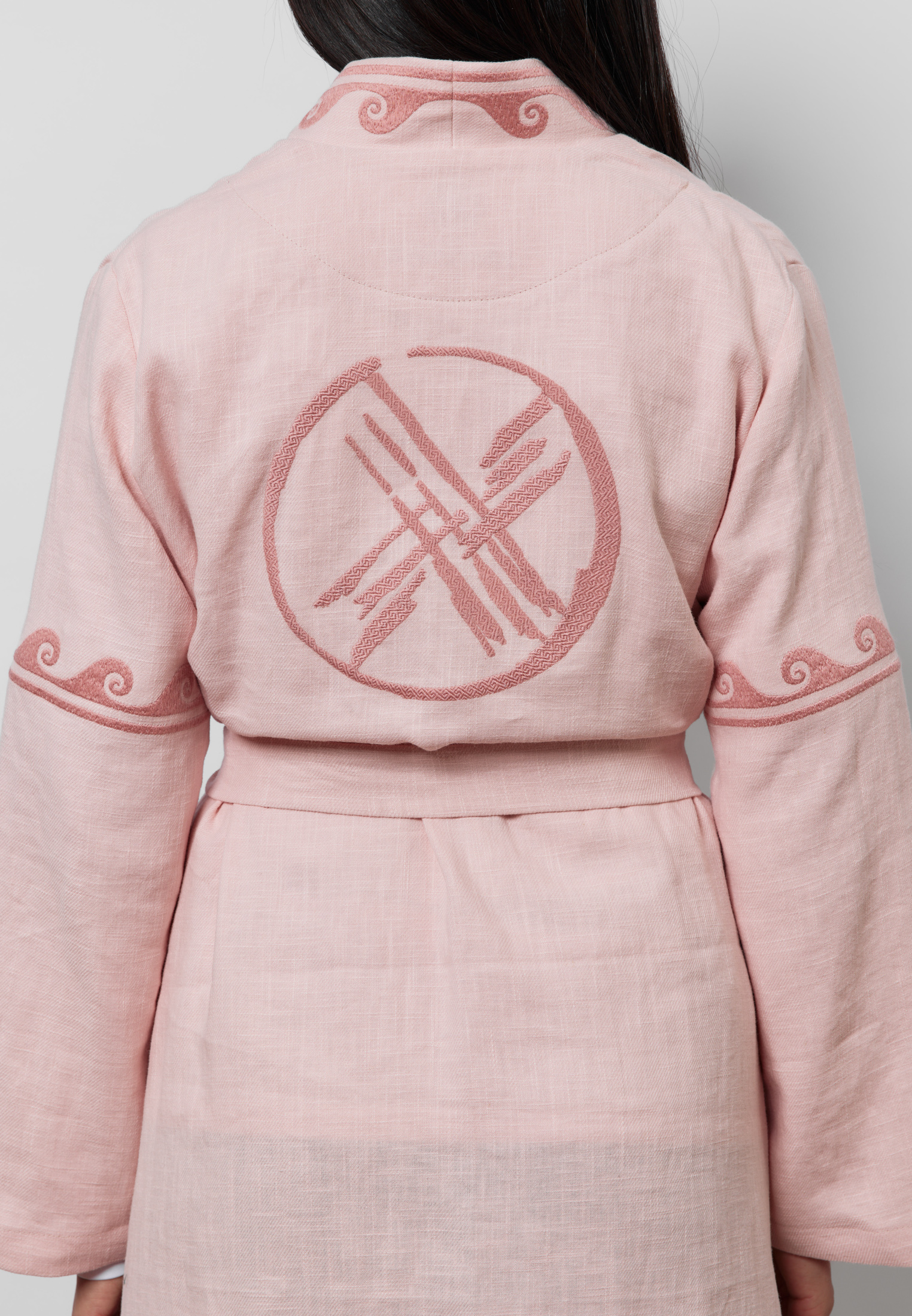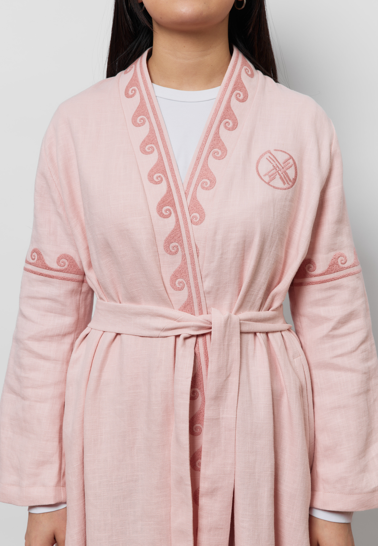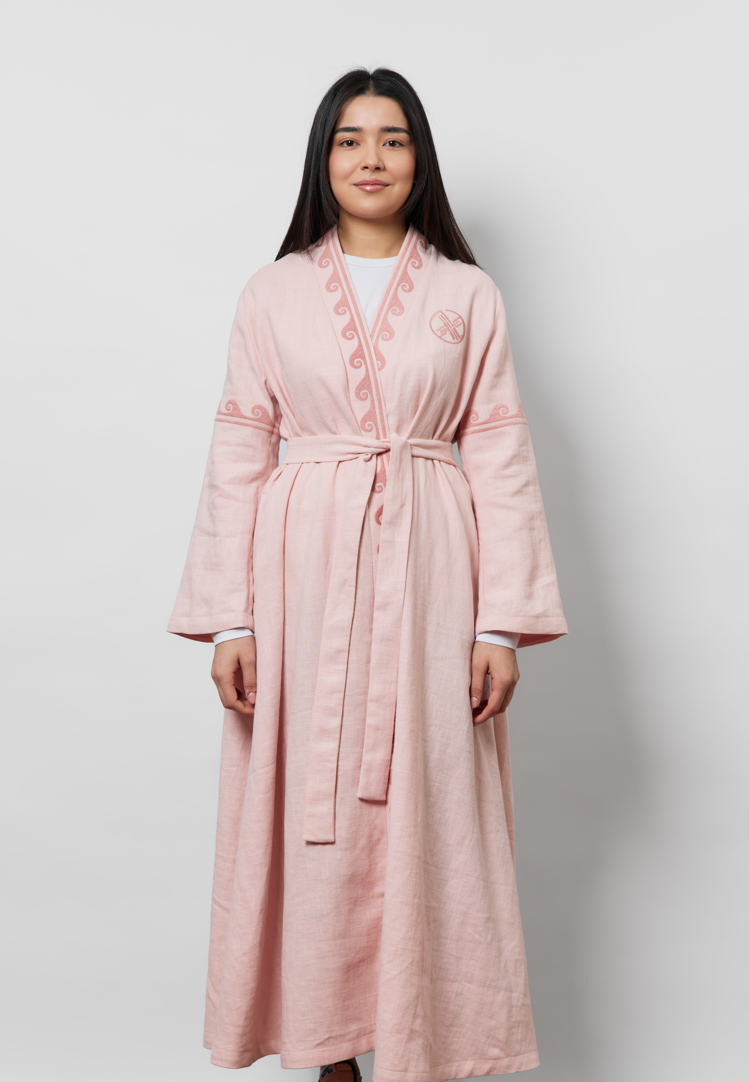 Льняной женский шапан ARGYMAQ в длине макси — лёгкая и элегантная интерпретация традиционного силуэта. Свободная форма, пояс на талии и орнаментальные акценты создают цельный, выразительный образ с национальным характером. Натуральный лён дарит комфорт и воздухопроницаемость, а макси-длина добавляет плавности, благородства и особой утончённости в движении.