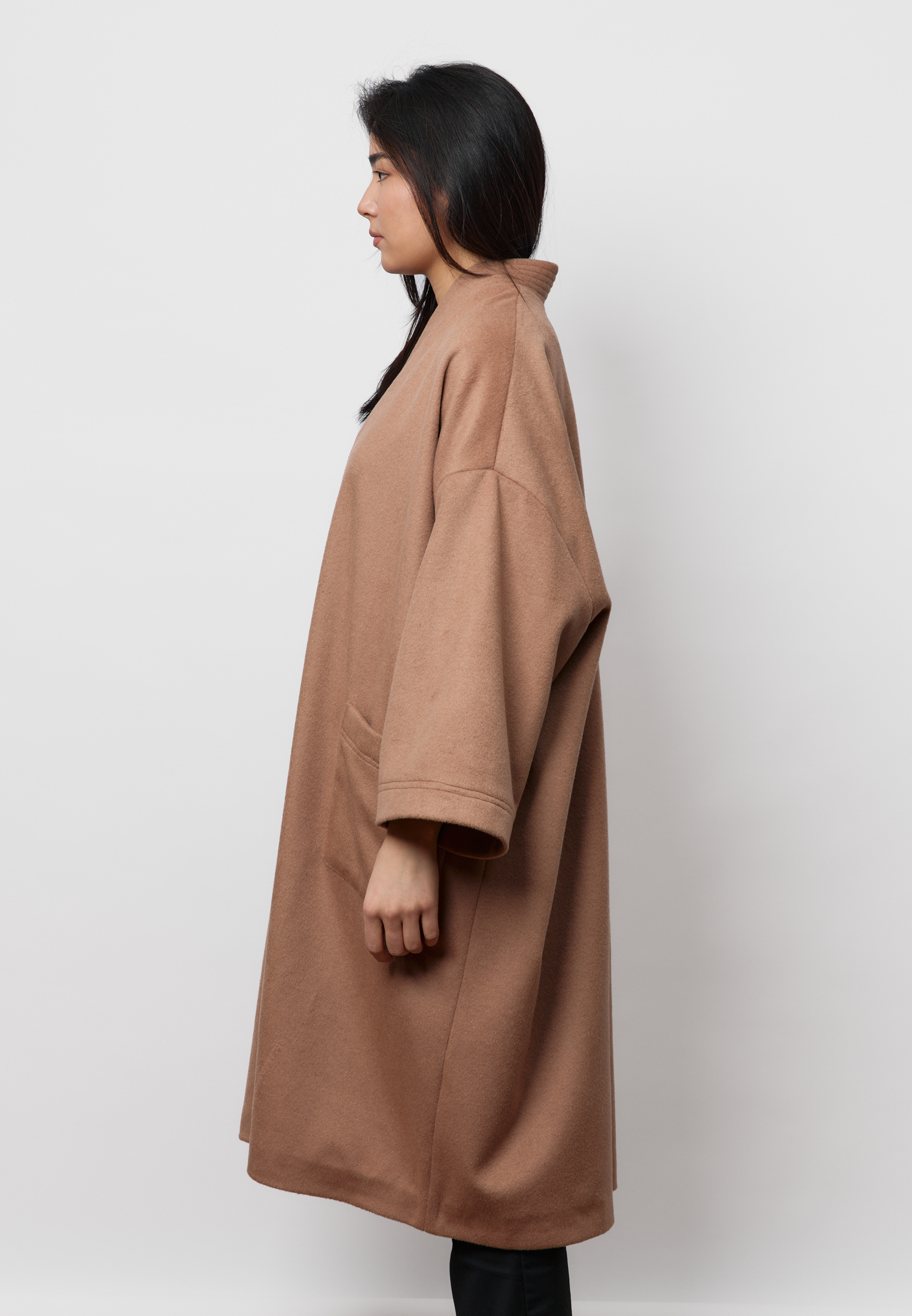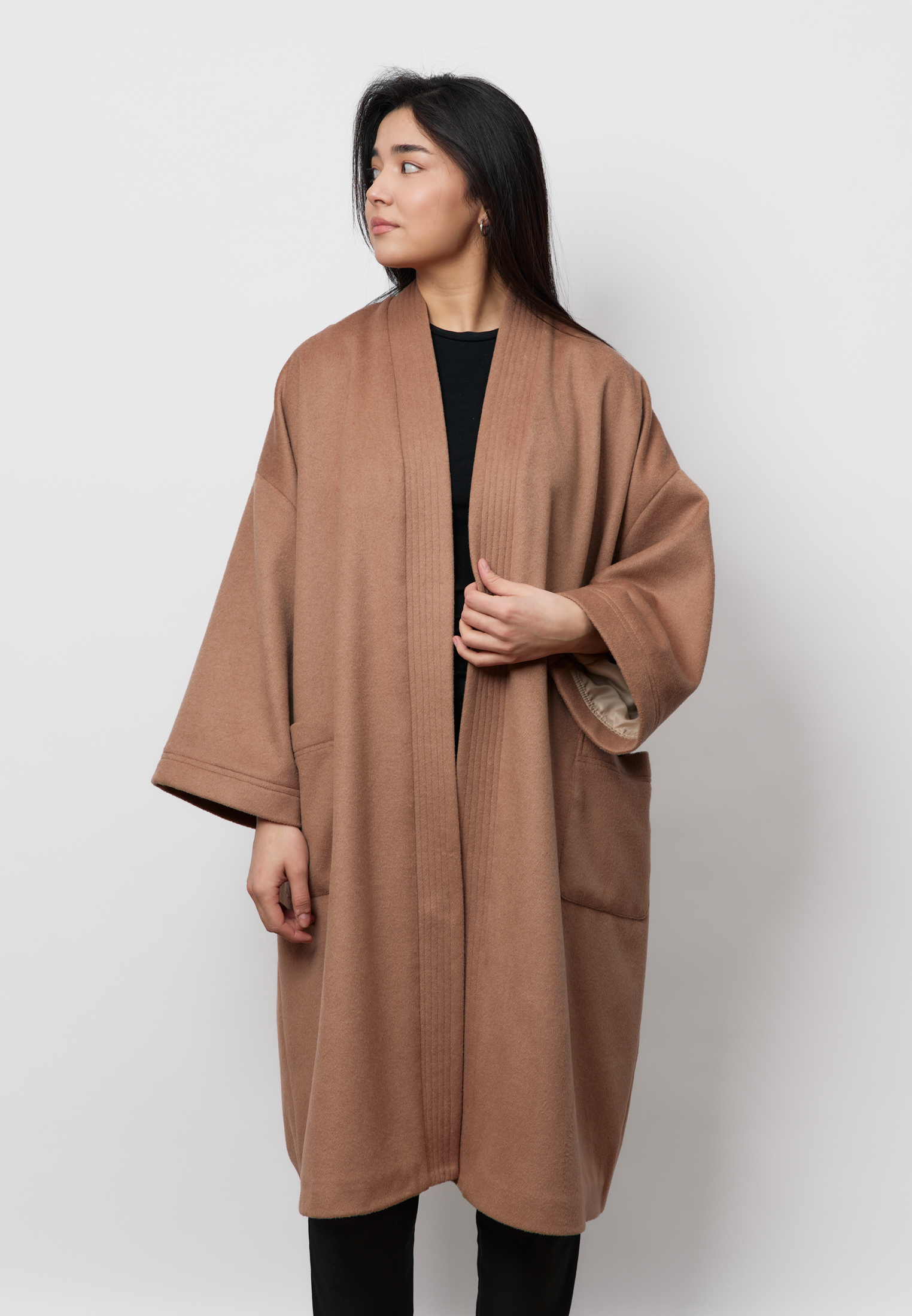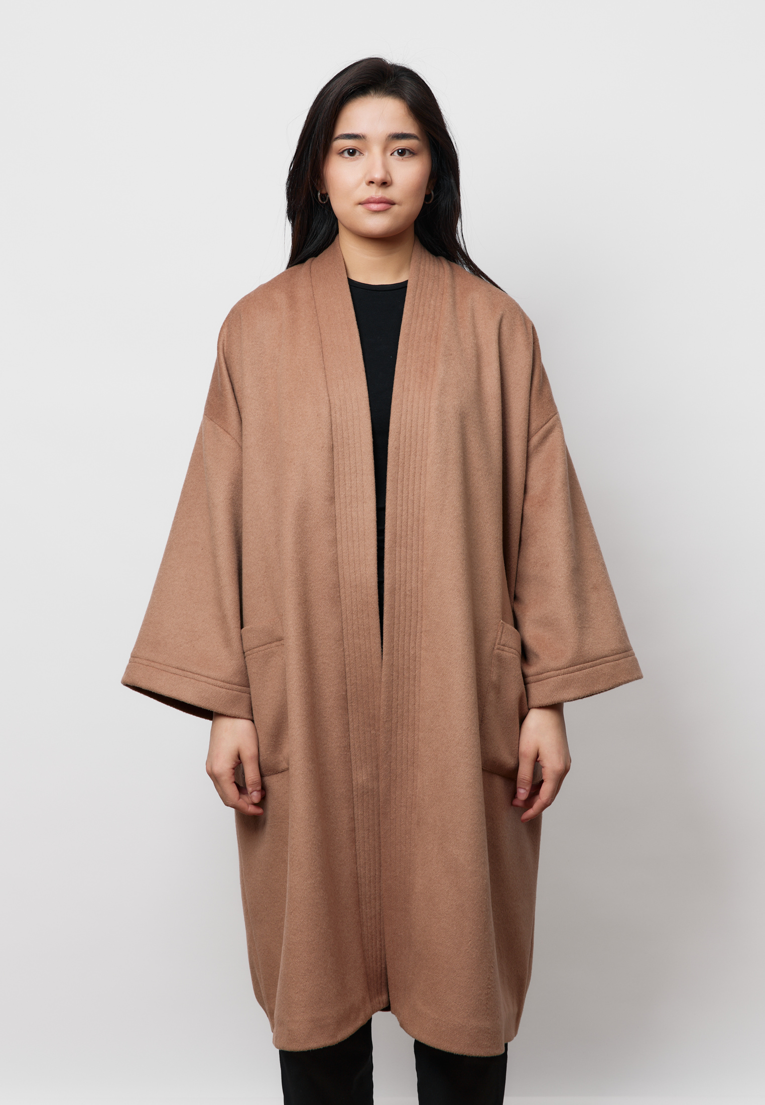 Удлинённый шерстяной шапан ARGYMAQ выполнен в оверсайз-крое и отличается мягким, свободным силуэтом. Модель на запах смотрится элегантно и непринуждённо, сохраняя баланс между комфортом и выразительной формой. Благородная шерстяная фактура подчёркивает характер изделия и делает его органичной частью актуального гардероба.