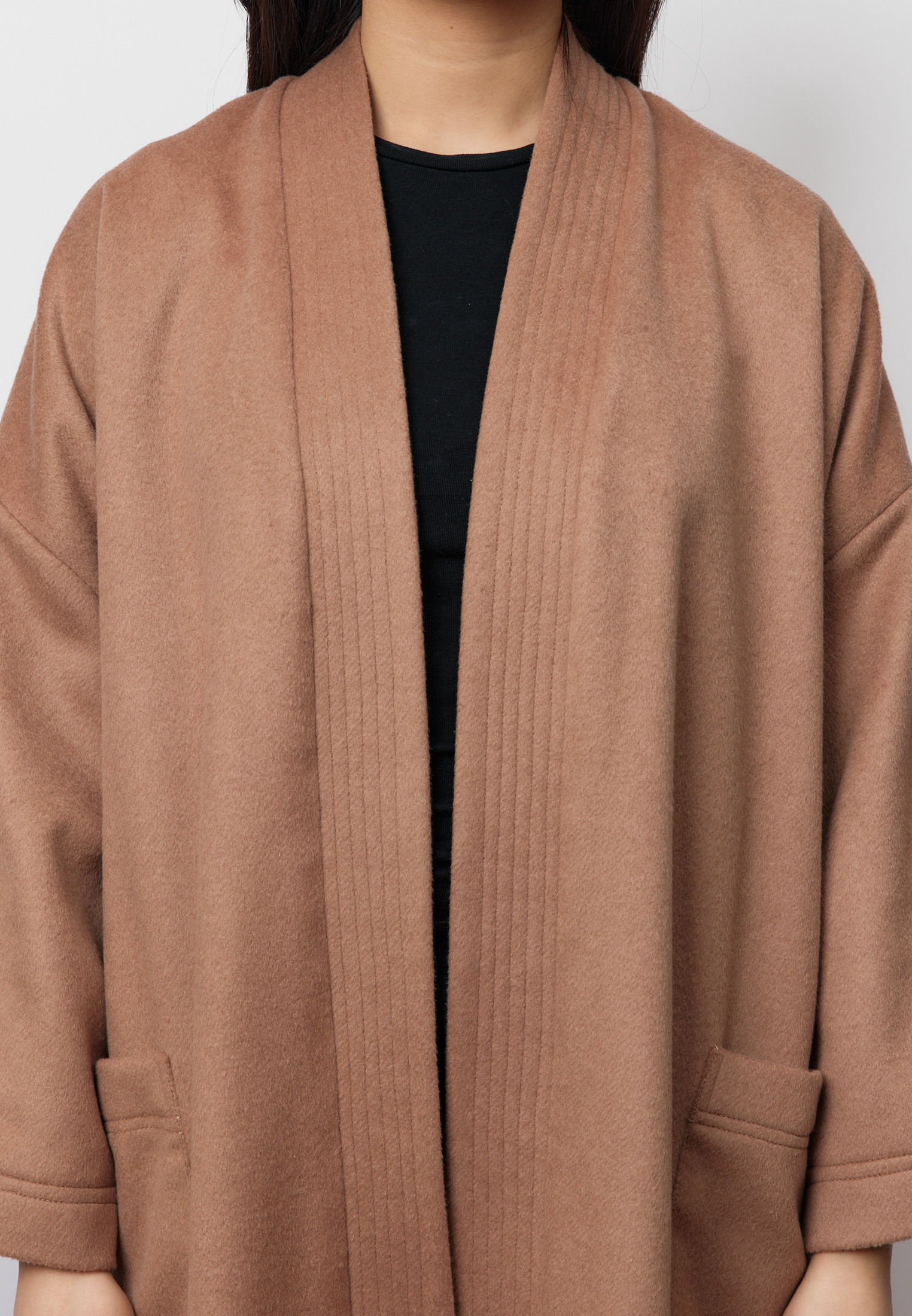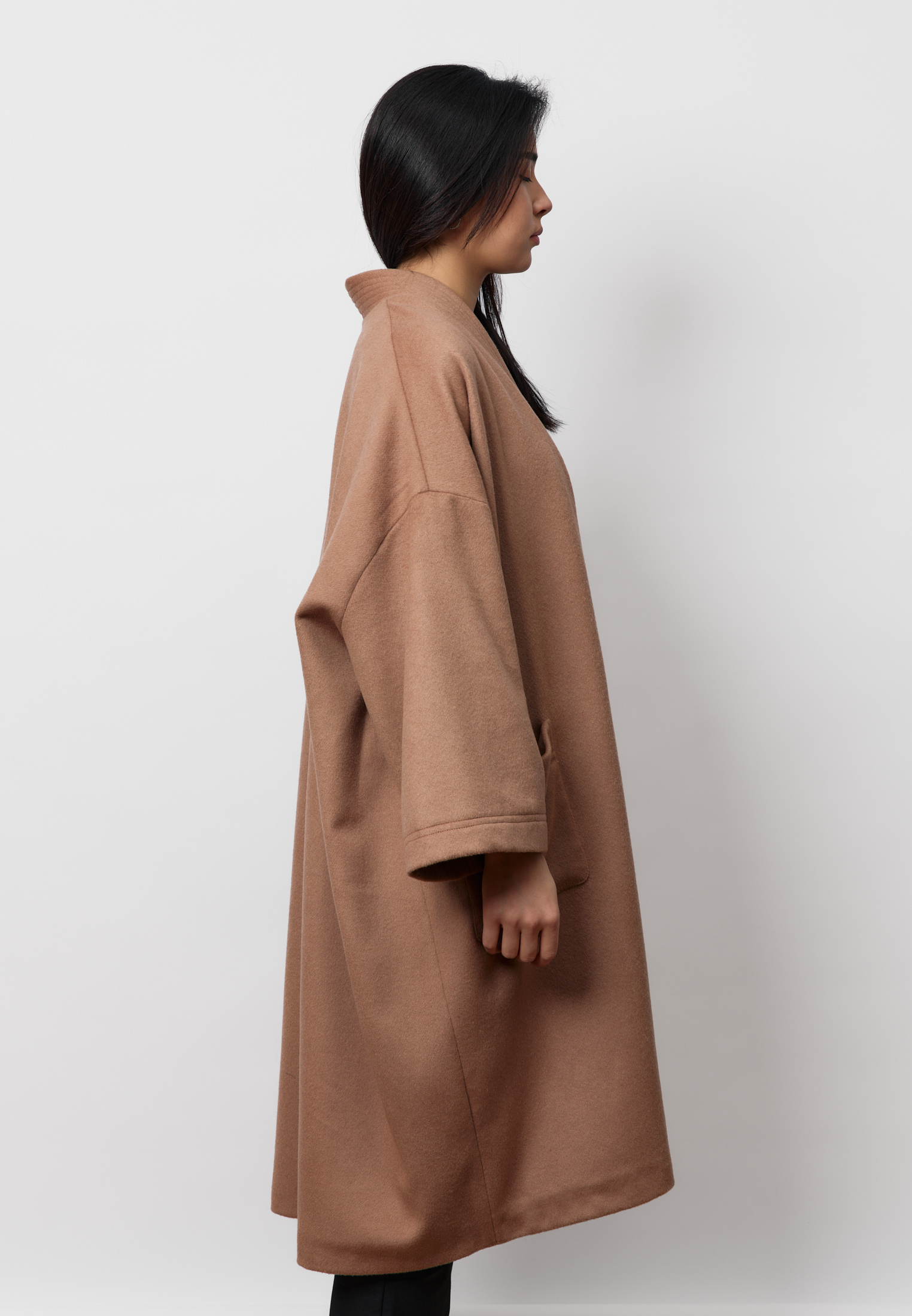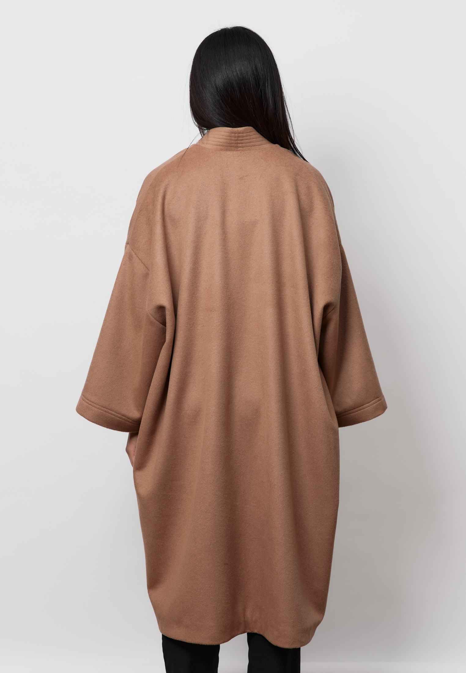 Удлинённый шерстяной шапан ARGYMAQ выполнен в оверсайз-крое и отличается мягким, свободным силуэтом. Модель на запах смотрится элегантно и непринуждённо, сохраняя баланс между комфортом и выразительной формой. Благородная шерстяная фактура подчёркивает характер изделия и делает его органичной частью актуального гардероба.