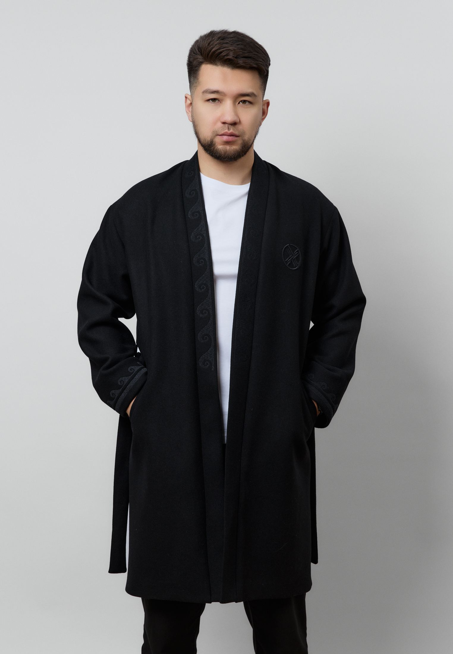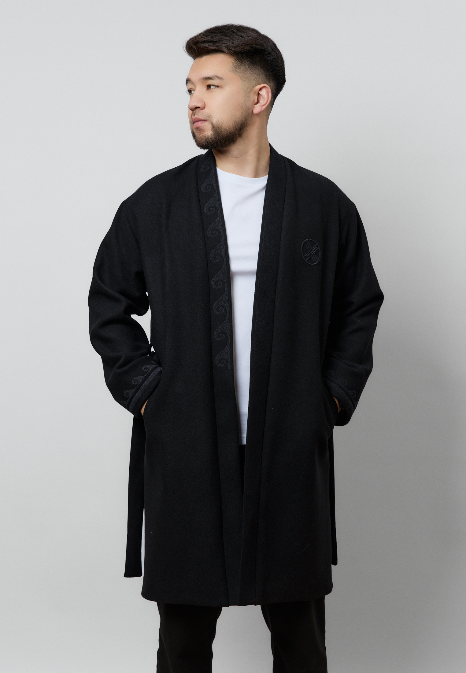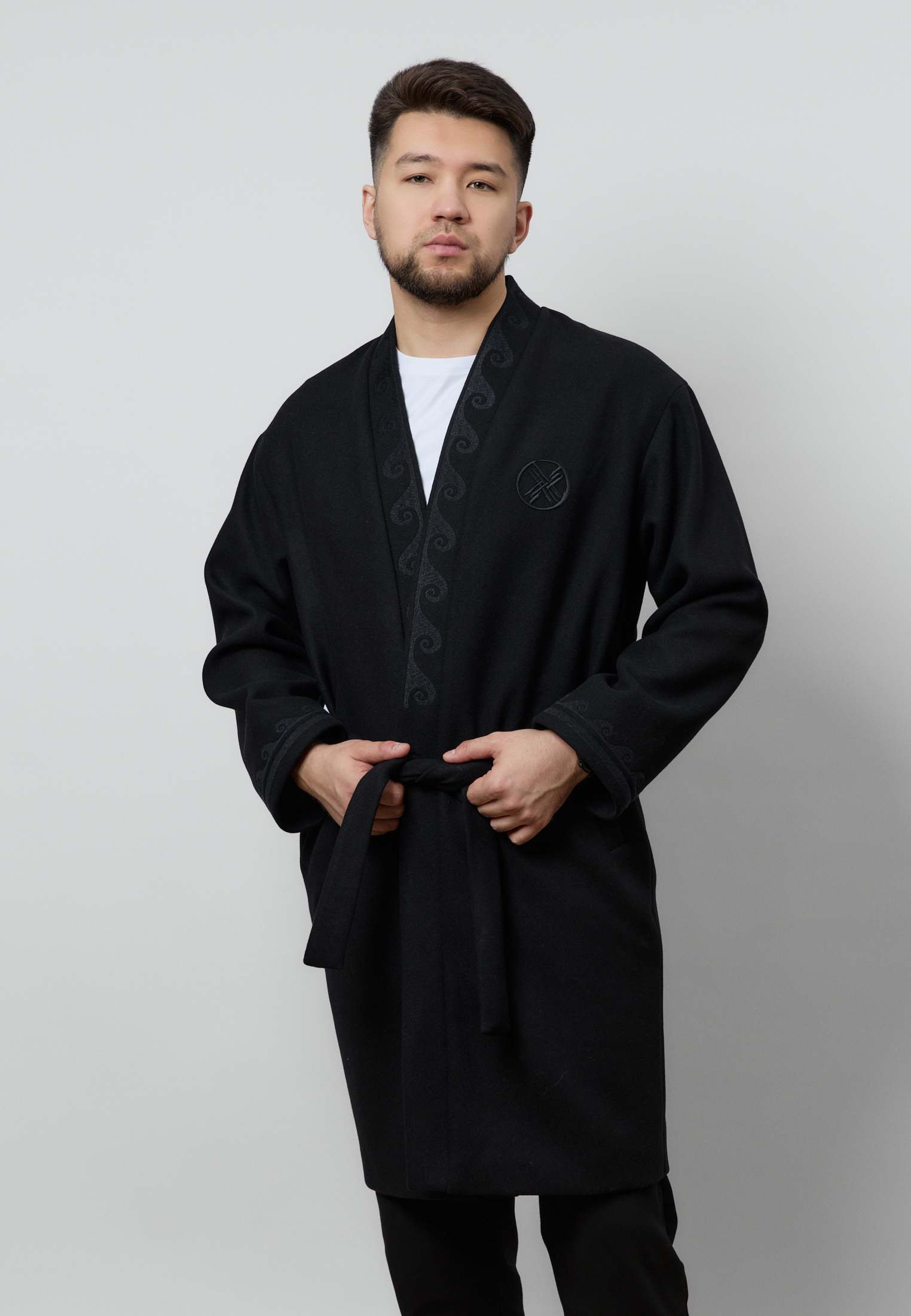 Шапан от бренда ARGYMAQ, изготовленный из 100% шерсти. Модель выполнена в прямом свободном крое, обеспечивающем комфорт и удобную посадку. Изделие украшено национальным орнаментом по борту и манжетам, а также аккуратной фирменной вышивкой на груди.