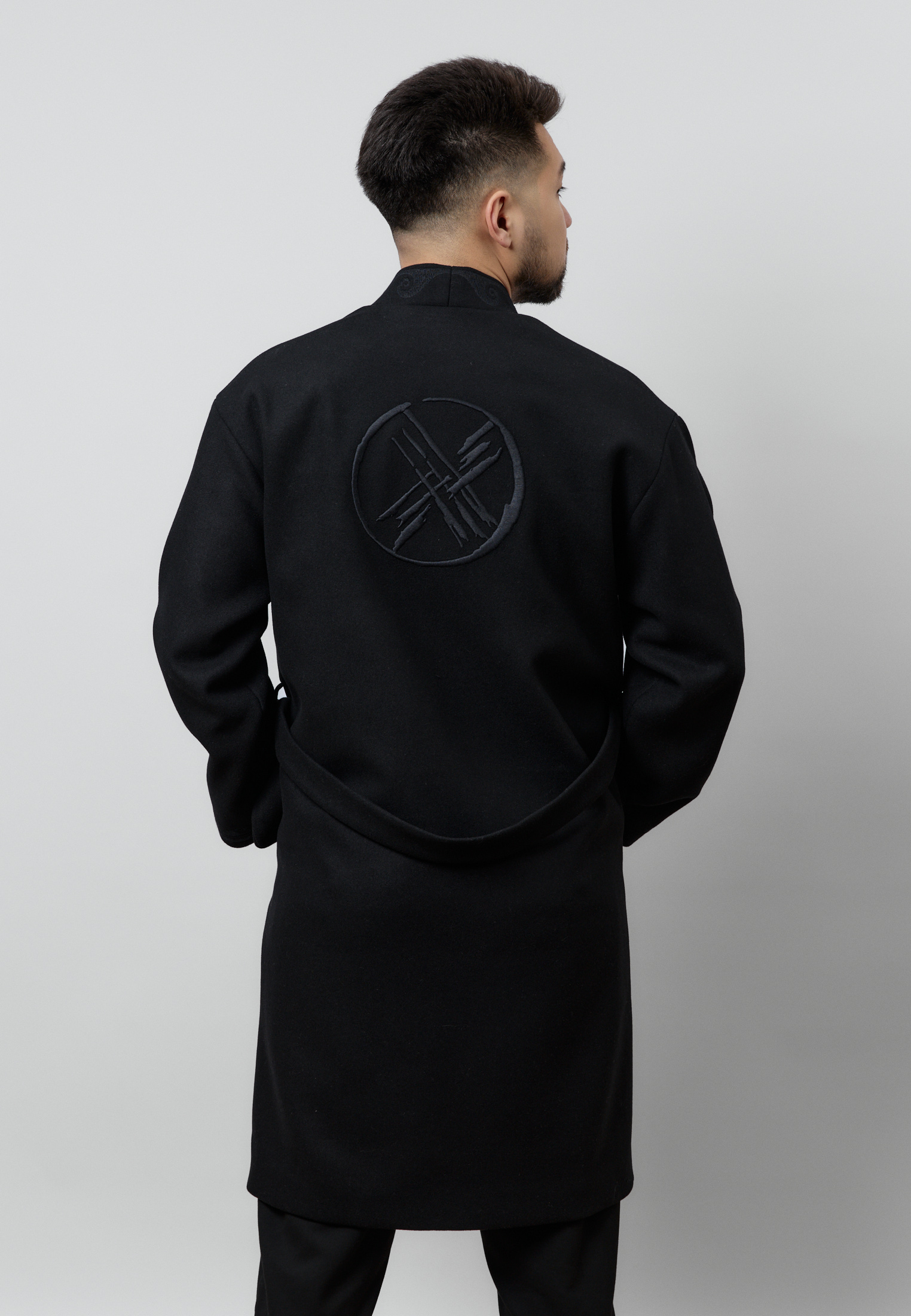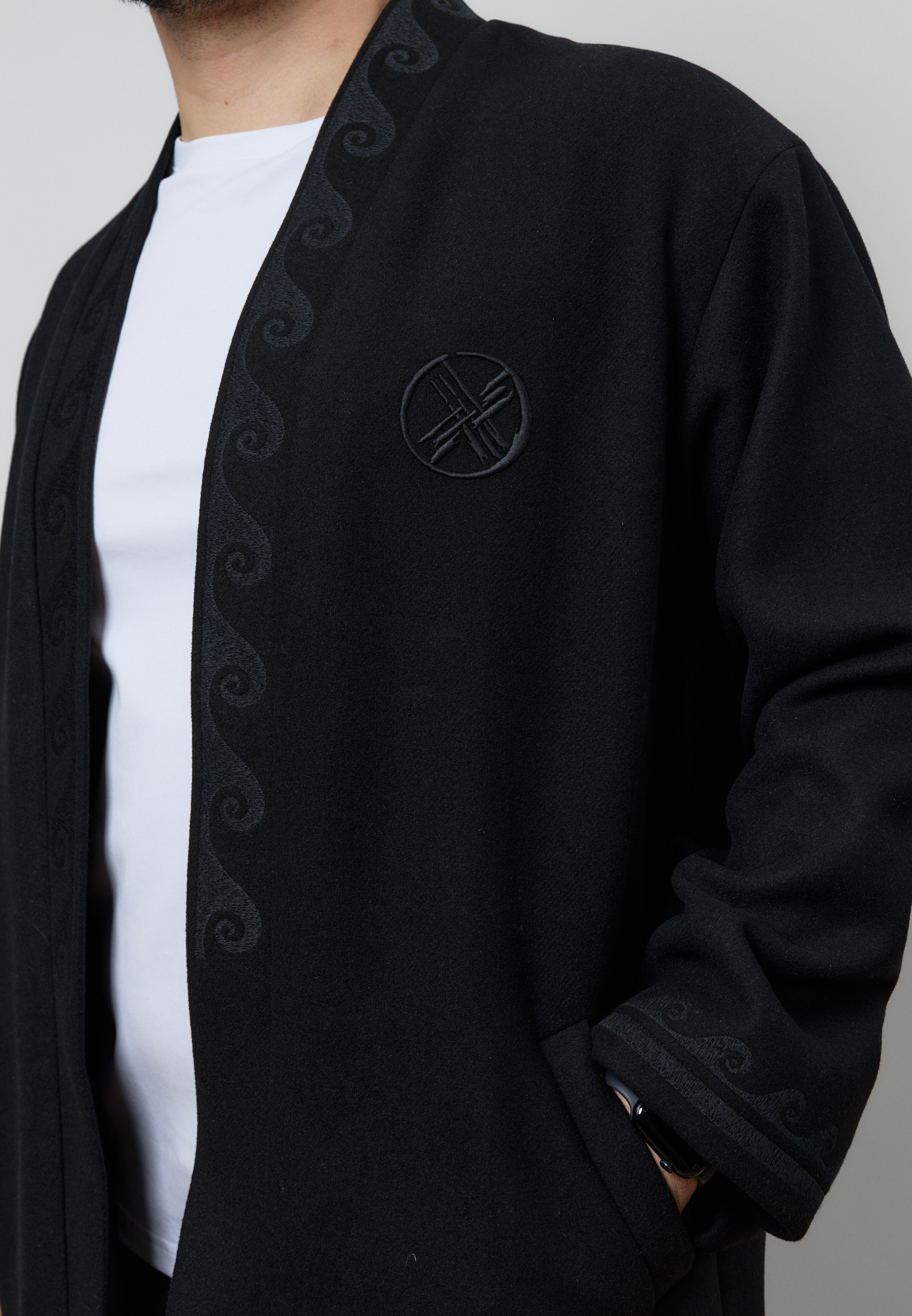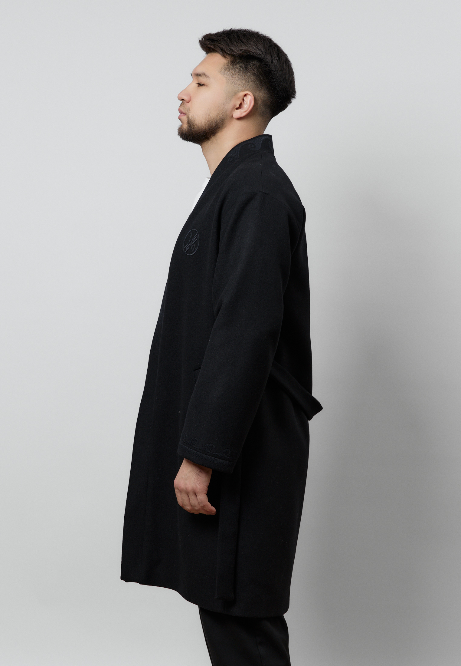 Шапан от бренда ARGYMAQ, изготовленный из 100% шерсти. Модель выполнена в прямом свободном крое, обеспечивающем комфорт и удобную посадку. Изделие украшено национальным орнаментом по борту и манжетам, а также аккуратной фирменной вышивкой на груди.