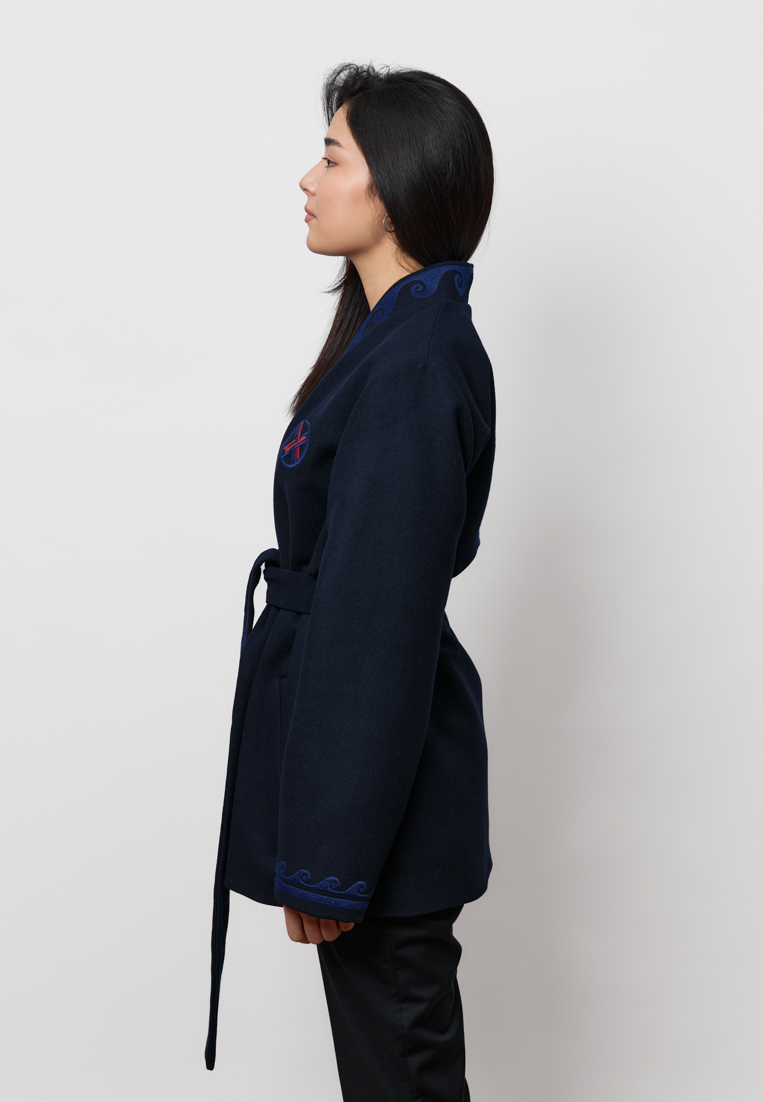 Короткий шерстяной шапан от ARGYMAQ — это современное прочтение национального силуэта в сдержанном и элегантном исполнении. Модель подчеркнута поясом на талии и дополнена декоративными орнаментальными акцентами, которые усиливают связь с культурным кодом бренда. Шерсть обеспечивает комфорт и тепло, делая изделие выразительным элементом гардероба.